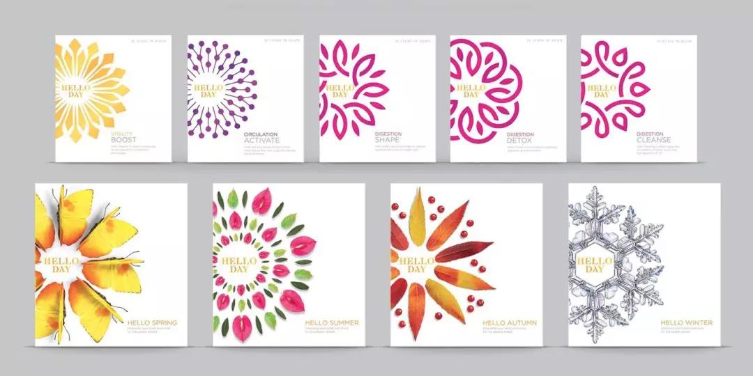 將包裝上的主要文字信息放在中間,用眾多的圖片元素將其包圍起來,重點突出文字信息。畫面會顯得活潑、豐富。
