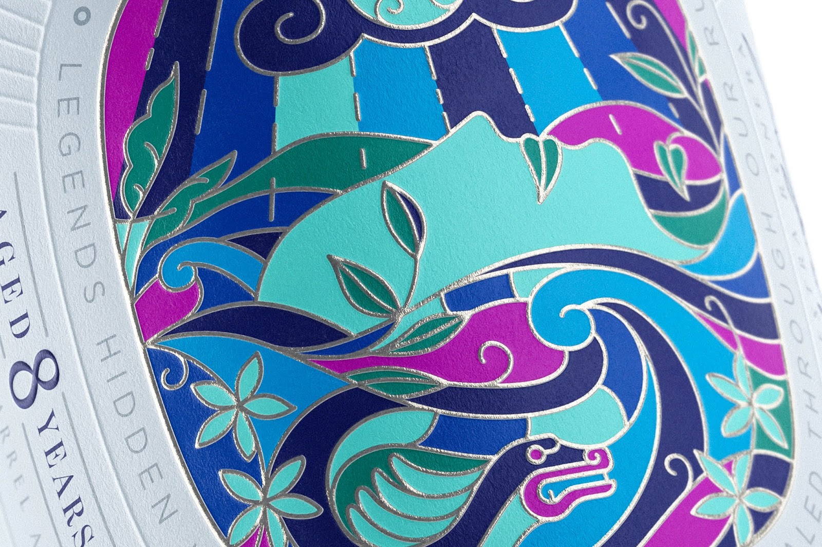 Cihuatan是一個來自薩爾瓦多的特制朗姆酒品牌。在納瓦特方言中,“Cihuatán”的意思是“女神熟睡的土地”。通過插圖刻畫鮮花綻放過程中的力量和美麗,通過女神睡顏表達女神的繁衍生息的力量。在工藝上“女神”的輪廓運用燙銀和凸紋的技術,讓畫面有了些許立體感,增強畫面層次。色彩上,采用當地特有的暖色和冷色搭配方式,讓文化的符號更加深入人心。