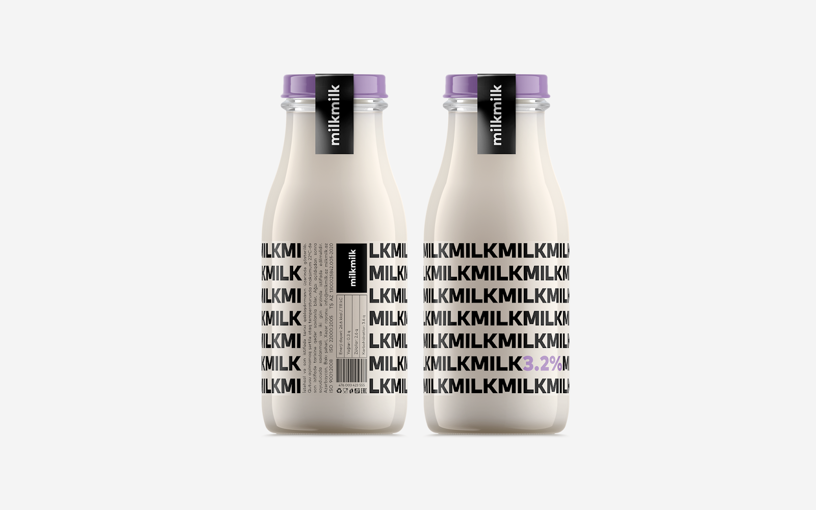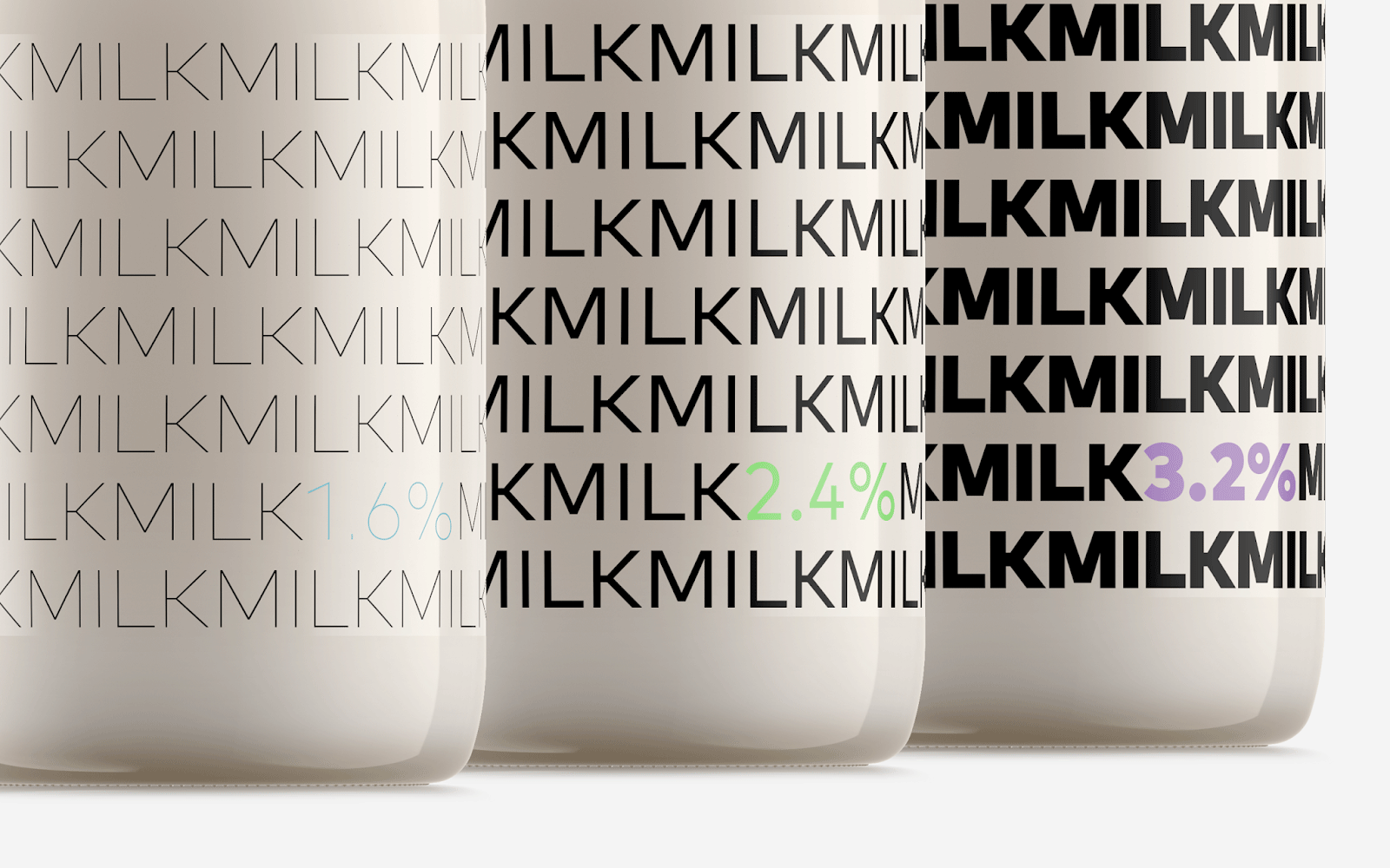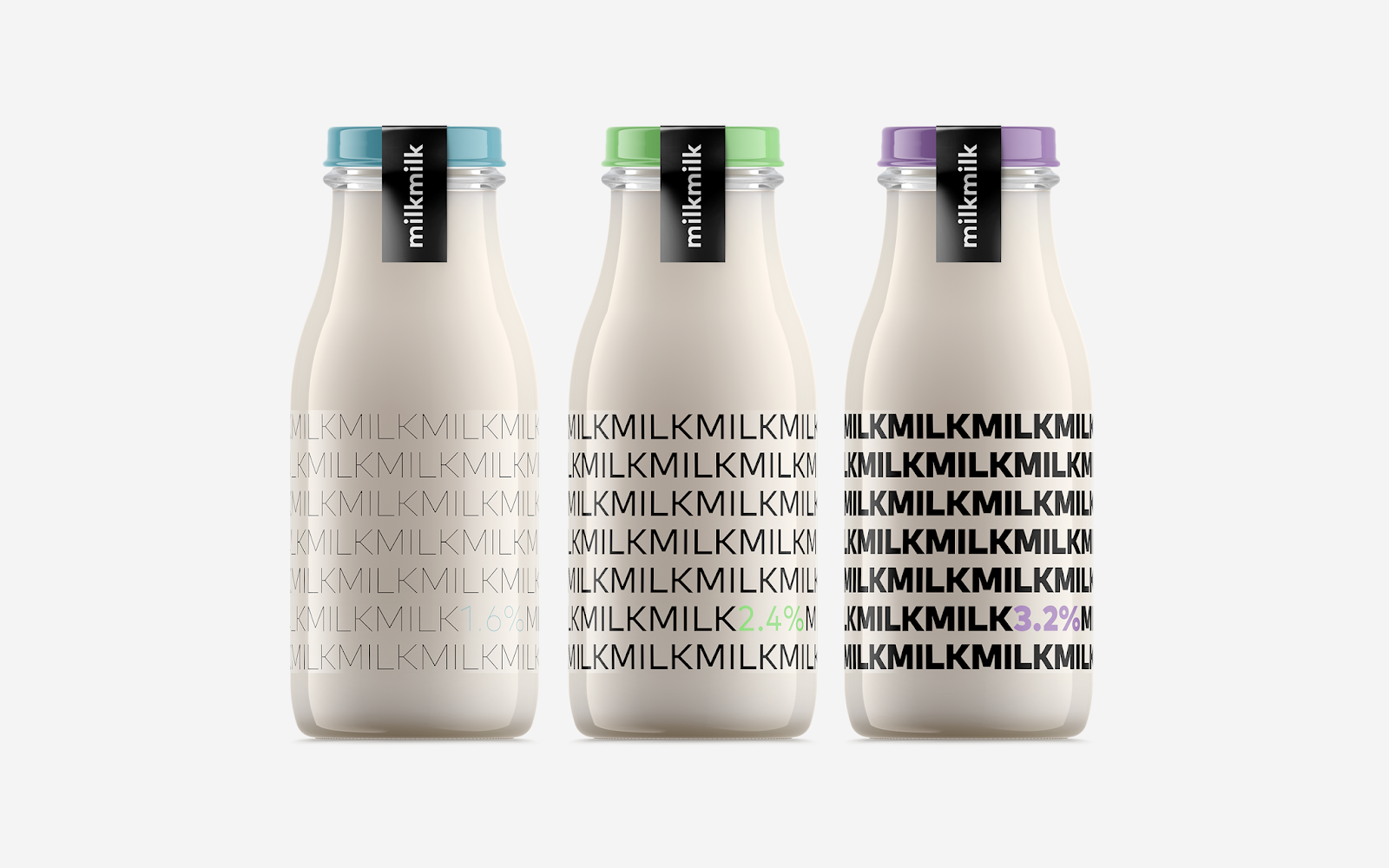 阿塞拜疆設(shè)計師Rahim Ismayil設(shè)計的牛奶包裝,設(shè)計師通過字體粗細來表現(xiàn)牛奶的脂肪含量。粗體字表示脂肪含量高,而細體字則表示脂肪含量低。通過瓶蓋顏色和極簡外觀讓人有一種新鮮直觀的感覺。讓人在遠處看到,想走近拿起來,進一步了解情況的沖動。